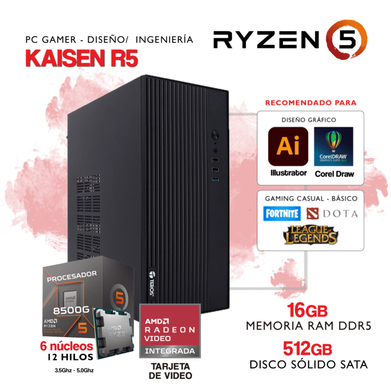 PC KAISEN R5 – AMD Ryzen 5 8500G – Gráficos AMD RADEON – 16Gb RAM DDR5 – 512Gb SSD SATA