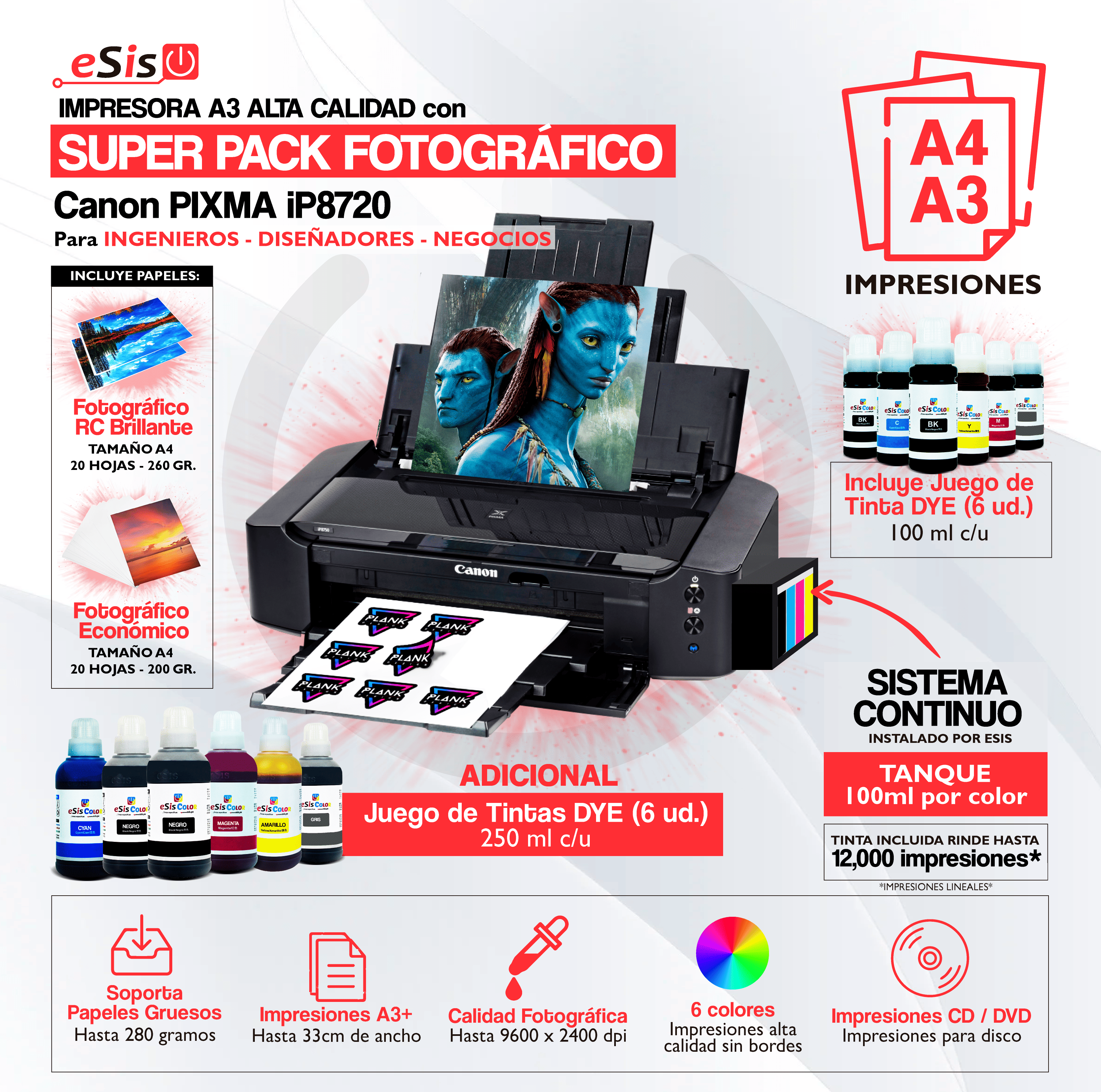 Impresora Canon PIXMA iP8720 (Sistema Continuo) + Kit Super Pack Fotográfico