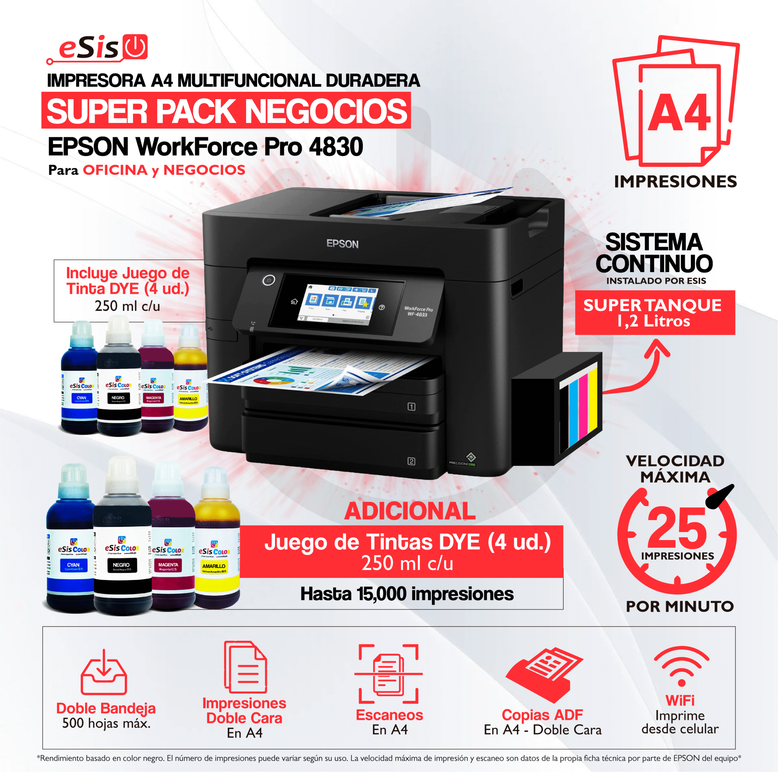 Impresora Epson WorkForce WF-4830 (Sistema Continuo) + Kit Super Pack Negocios