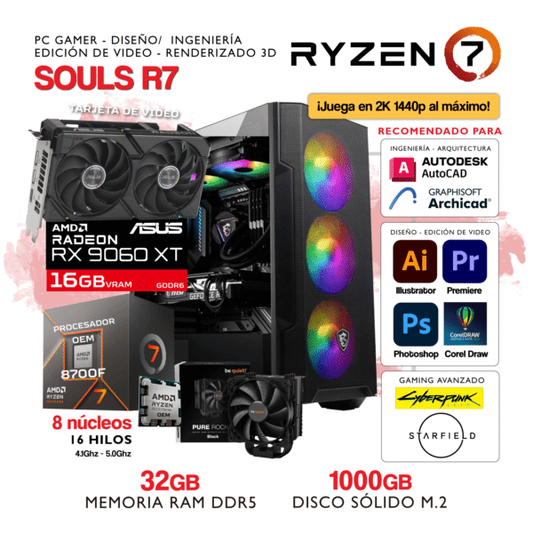 PC SOULS R7 – AMD Ryzen 7 8700F – AMD RADEON RX 9060XT 16Gb – 32Gb RAM DDR5 – 1000Gb SSD M.2