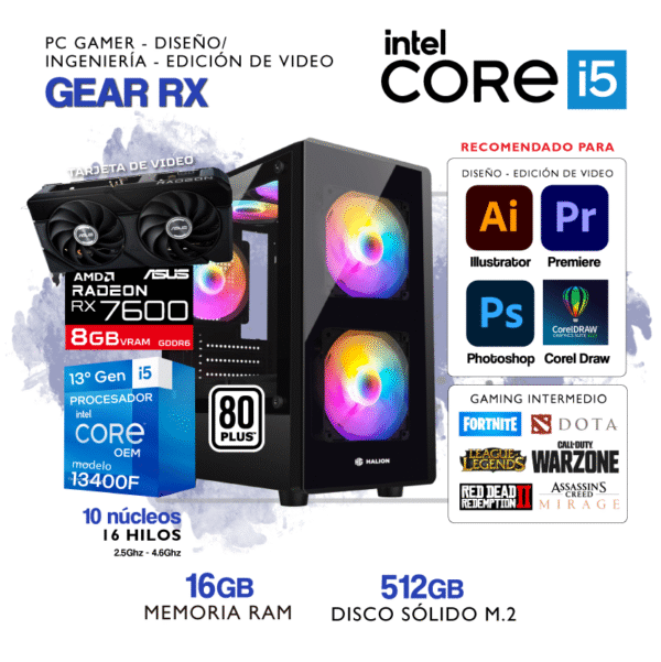PC GEAR RX – Intel Core i5 13400F – AMD RADEON RX 7600 – 16Gb RAM – 500Gb SSD M.2