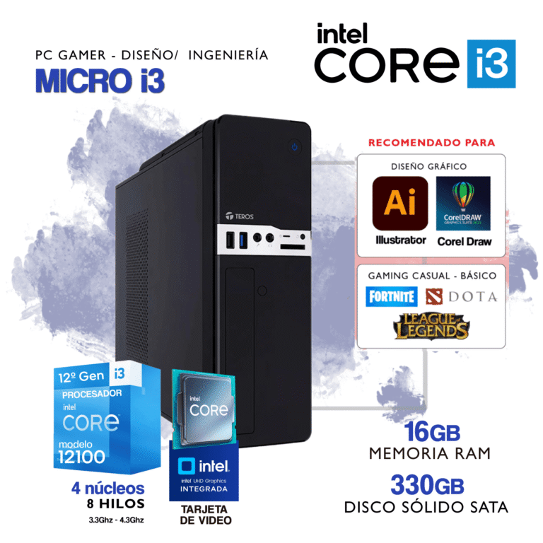 PC MICRO i3 – Intel Core i3 12100 – 12° Generación – 16Gb RAM – 330Gb SSD SATA